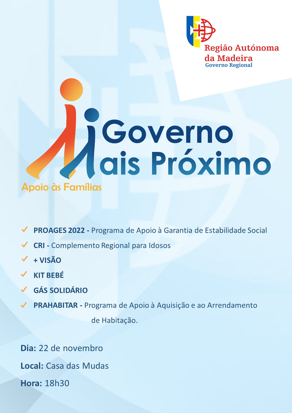 No próximo dia 22 de novembro, pelas 18:30h, no auditório do Mudas terá lugar a apresentação do programa “Governo Mais Próximo” – apoio às famílias, que contará com a presença da Sr.ª Secretária Regional da Inclusão e Cidadania.