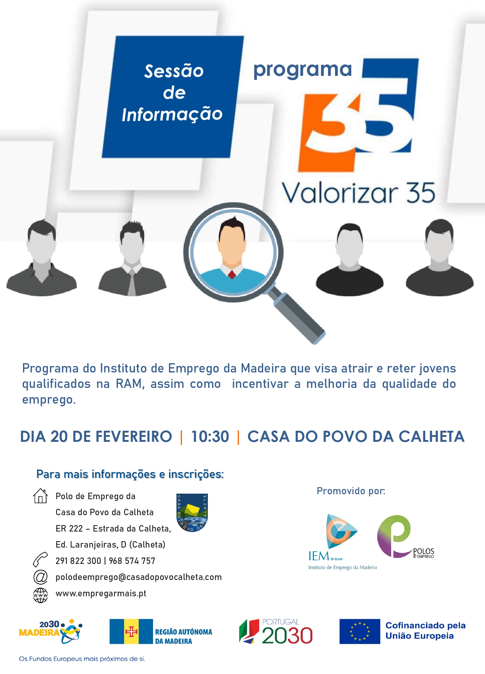 O Polo de Emprego da Casa do Povo da Calheta, no âmbito do seu Plano de Atividades para o corrente ano, irá promover uma sessão de informação sobre o Programa Valorizar 35, uma medida do Instituto de Emprego da Madeira.