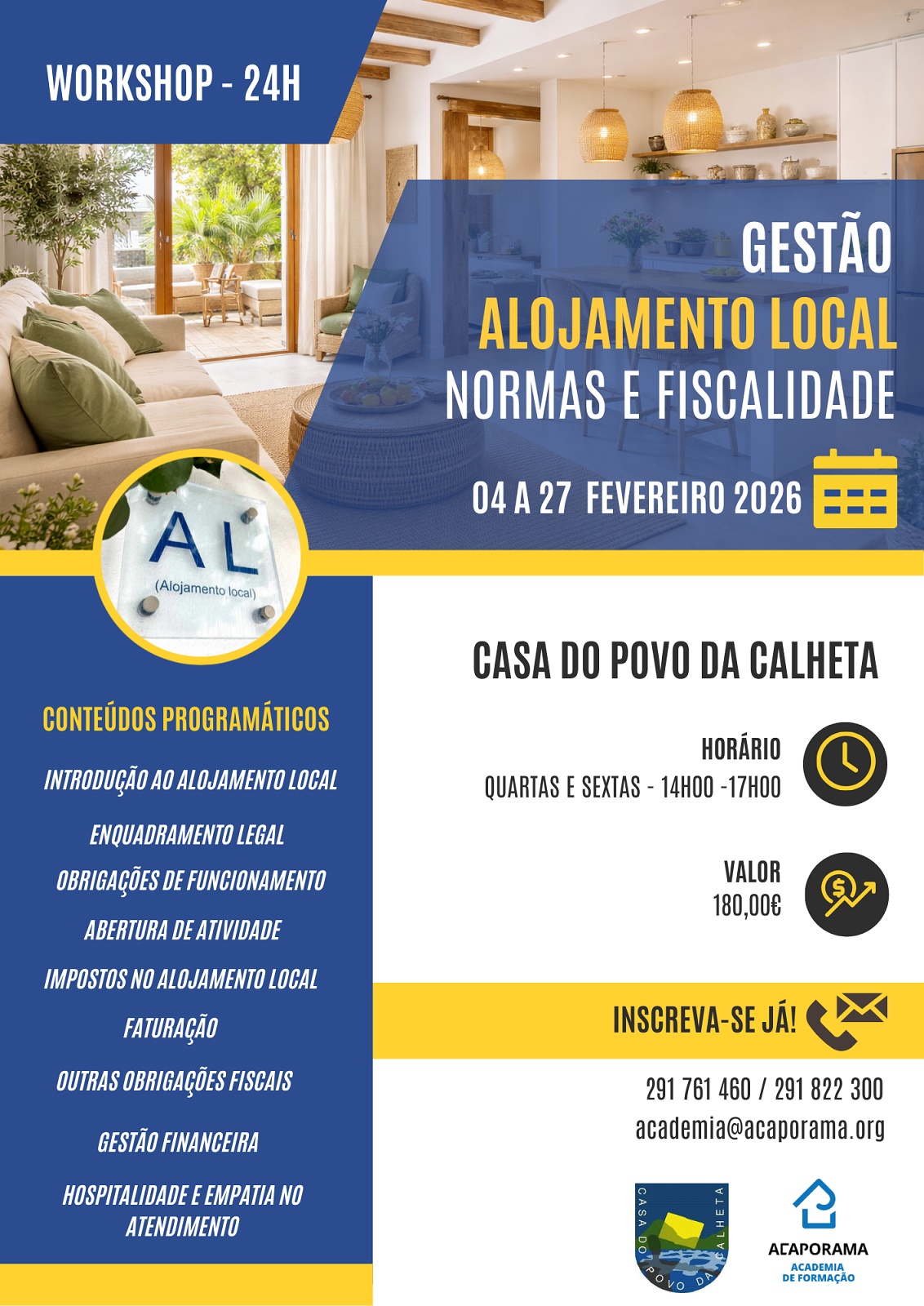 A Casa do Povo da Calheta, em parceria com a ACAPORAMA, promove um workshop de Gestão de Alojamento Local, desenvolvido para capacitar as pessoas que pretendam estruturar, organizar e rentabilizar o alojamento local, proporcionando ferramentas essenciais para uma gestão profissional, mesmo para quem está a iniciar atividade.